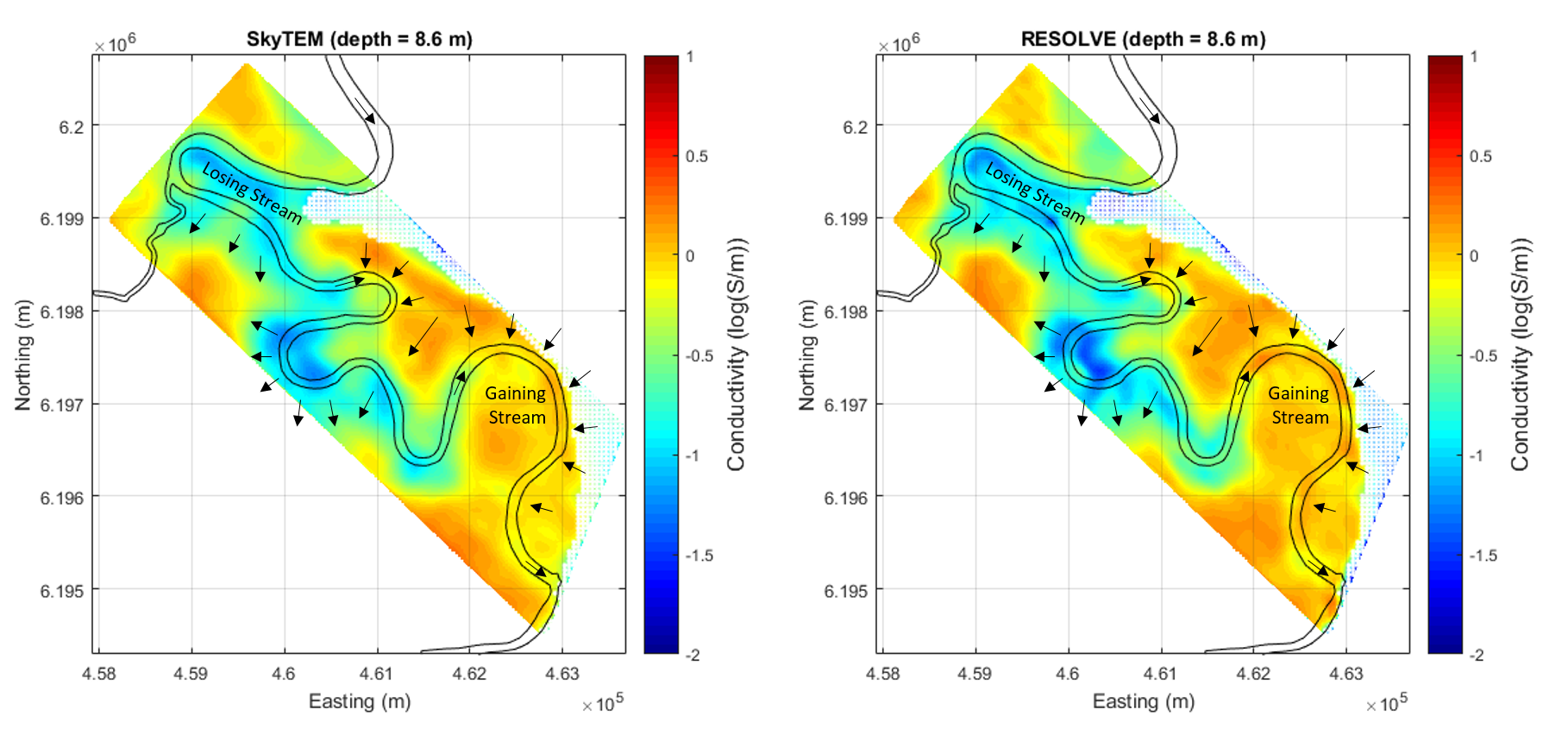 We are also able to extract information about the dynamics of the water flow Fig. 350. Because the riverwater is fresh and resistive, the low conductivity at the upstream section suggests the river loses water, and the fresh riverwater flushes the floodplain, forming a “losing stream”. In contrast, at the downstream section, the hydraulic gradient from the highland drives saline water into the river and the floodplain, forming a “gaining stream” of the river. The complete swamping by the intrusive saline water shows that the river is not able to effectively recharge the floodplain with fresh water for the health of vegetation. If looking closely, we can also see that some locations have higher salinity in the RESOLVE (2008) model than in the SkyTEM (2006) model, possibly an evidence of severer salinization over two years.