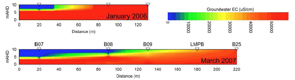 At Bookpurnong, hydrogeologists have sampled and measured the electrical conductivity of the groundwater along several transects across the river floodplain Fig. 340 [HJMcEwan1+08]. The measured conductivity from several wells along Transect 3 is plotted as cross sections from the river bed to the bank both before and after SIS Fig. 341.