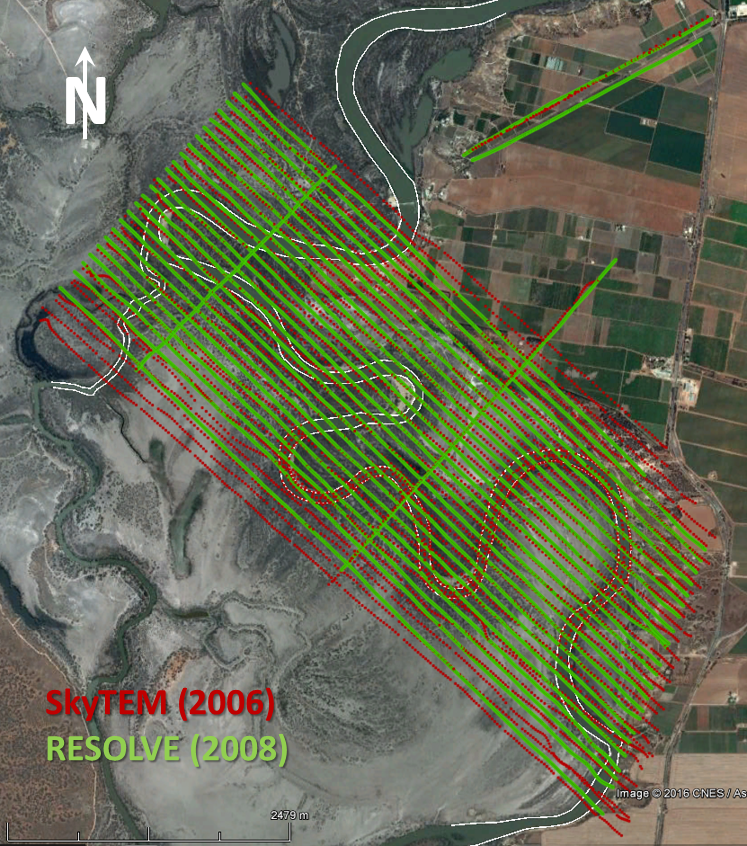 Fig. 344 RESOLVE and SkyTEM flight lines at Bookpurnong.¶