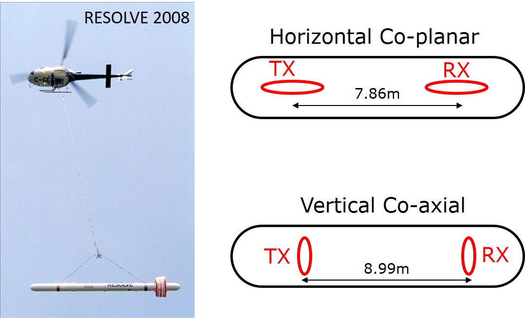 The airborne frequency-domain system used at Bookpurnong was RESOLVE (Fig. 342), operated by Fugro Airborne (now CGG). It operates five pairs of horizontal co-planar (HCP) loop- loop configurations at 382, 1822, 7970, 35920 and 130100 Hz, and one pair of vertical co-axial loop-loop configuration at 3258 Hz. The measured secondary magnetic field (Hs) is represented as the ratio to the primary field (Hp) in part per million. As the towded bird moves forward along flightl lines, the system continuously records the data (Hs/Hp) for every loop-loop pairs at the corresponding frequencies.
