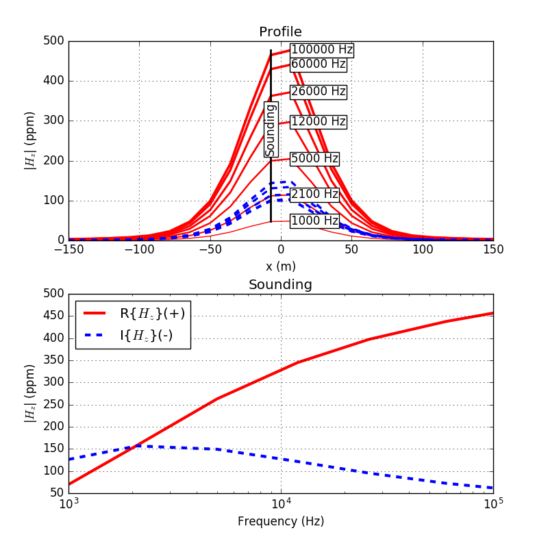 Fig. 182 Top: An airborne FDEM profile over the conductive sphere for a range of frequencies. Bottom: The frequency sounding from a single location marked in the top panel.¶