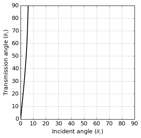 Fig. 75 Tranmission angle \(\theta_t\) as a function of the incident angle \(\theta_i\) when \(\sigma_1\) = 1 S/m and \(\sigma_2\) = 0.1 S/m. Magnetic permeability and dielectric permittivitivy assumed to be those of free-space (\(\epsilon = \epsilon_0\) and \(\mu = \mu_0\))¶