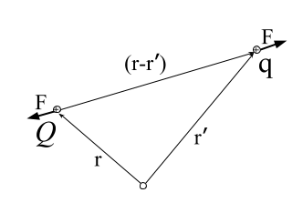 where \(\mathbf{F}\) is the force between the two charges \(q\) and \(Q\), \(|\mathbf{r} - \mathbf{r'}|\) is the distance between the charges and \(\mathbf{\hat{\underline{r}}}\) is a unit vector in the direction of the line separating the two charges.