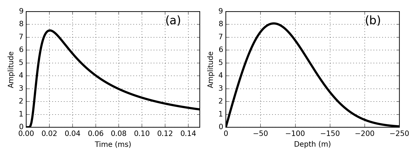 Fig. 52 Electric field as a function of time 100 m from a 1D impulse in the field in a 0.01 S/m whole space (a). Electric field at t = 0.03 ms as a function of distance (Modifed from [WH88]) (b).¶