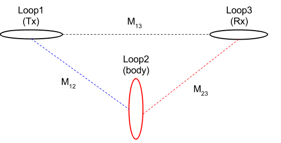 Let us suppose that alternating current, \(I_1 e^{\imath \omega t}\) is made to flow in the Tx (Loop 1). This current generates an alternating magnetic field in the surrounding environment, which in turn induces an EMF both in the body (Loop 2) and the Rx (Loop 3). These EMFs are governed by Faraday’s Law