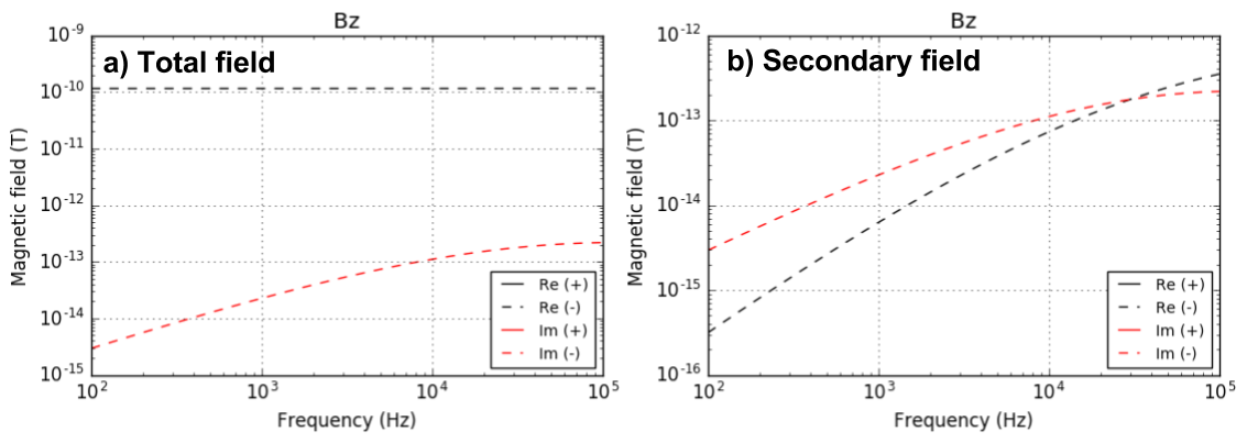 Fig. 100 Meausured real component of \(B_z\) data as a function of frequency at Rx when Tx-Rx offset is 10 m. Total a) and secondary b) \(B_z\).¶