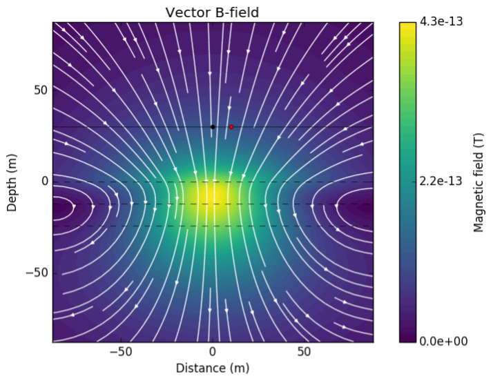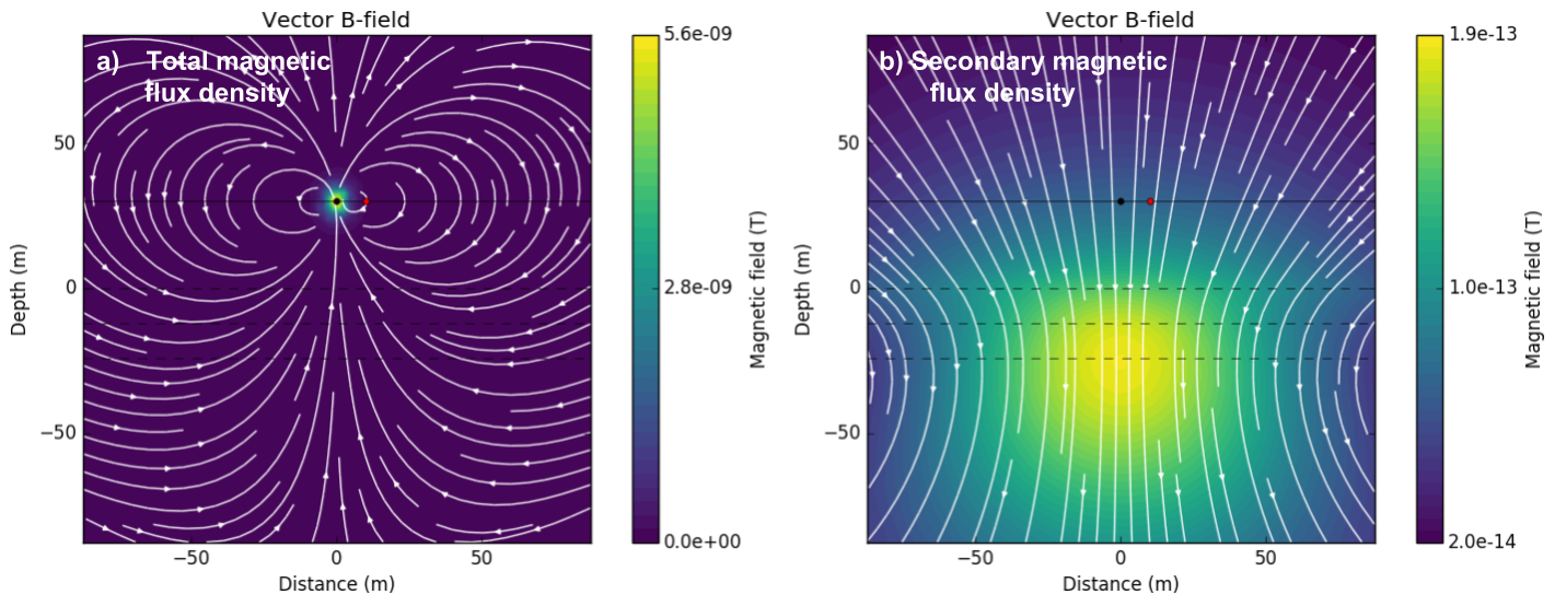 Different from the imaginary part of \(\mathbf{B}\), real part includes both primary and secondary magnetic flux. Fig. 99 a and b show the real part of total and secondary magnetic flux density as a vector. Primary flux is dominant in \(\mathbf{B}\) hence signficantly localized close to Tx location, while secondary flux induced in the conductive earth are much more spreaded. Direction of the total (upward) and secondary flux (downward) is opposite in general. In practice, we cannot measure magnetic fields everywhere, but