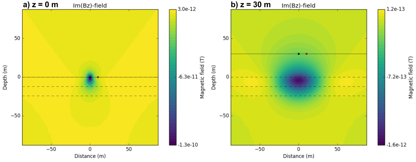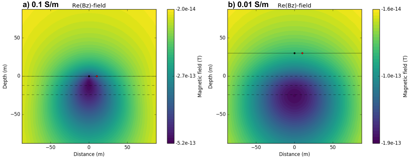 Fig. 104 Real part of \(B_z\)-direction in \(x\text{-}z\) plane. \(\sigma_{earth}\) = 0.1 S/m a) and 0.01 S/m b).¶