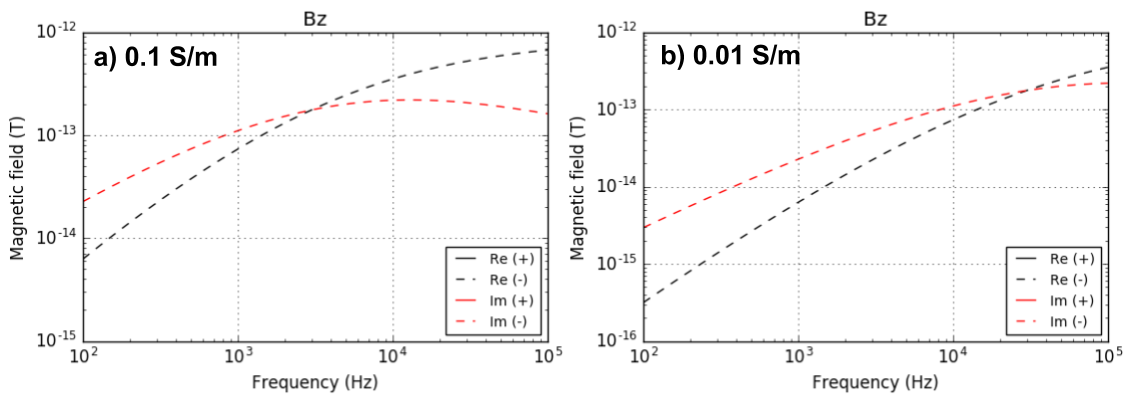Fig. 105 Meausured real component of \(B_z\) data as a function of frequency at Rx when Tx-Rx offset is 10 m. \(\sigma_{earth}\) = 0.1 S/m a) and 0.01 S/m b).¶