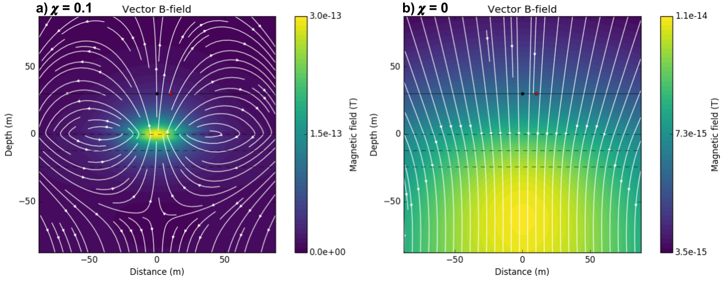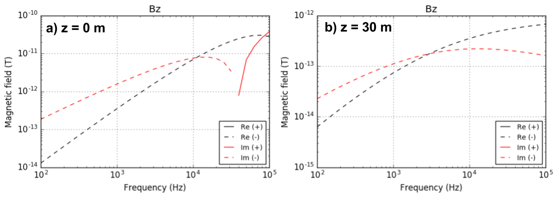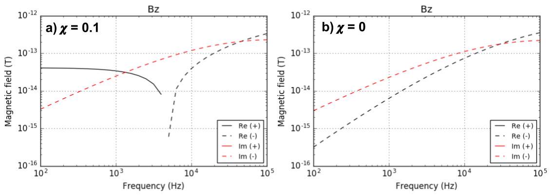 We consider effect of magnetic currents shown in Eq. (382). Upon the definition of primary magnetic flux \(\mathbf{B}^p\), effects of susceptibility is not contained in \(\mathbf{B}^p\), but included in secondary flux \(\mathbf{B}^s\). Similar to the physics of magnetic survey, even static magnetic flux (zero frequency) will excite susceptible medium in the direction of primary magnetic flux indicating this secondary magnetic flux will be in the same direction of primary magnetic flux. Fig. 106 a and b show real part of magnetic flux when \(\chi\)chi`=0, respectively. Difference between these two cases are drastic especially at near surface. And at location where Rx is located direction of the magnetic flux is opposite. Fig. 107 shows measured \(B_z\) component for those two cases. When frequency is low, real part of \(B_z\) when \(\chi\) = 0.1 has positive sign, whereas the sign changes to negative when frequency gets higher. Imaginary part of \(B_z\) for two cases do not show significant difference indicating effects of susceptibility is minor in this component.