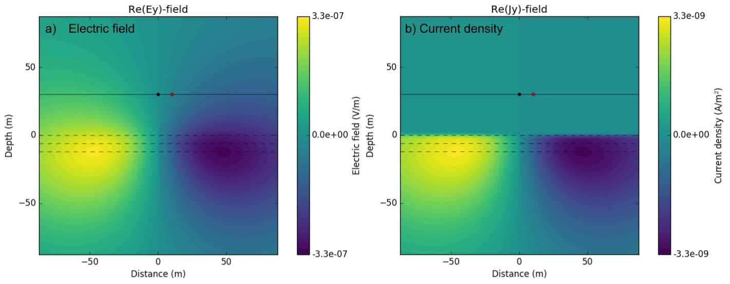 Using the setup shown in Fig. 96, we perform a simulation, compute electric, magnetic flux, and current density. Here \(z\) = 30 m, \(\sigma_{earth}=0.01\) S/m, \(\mu_{earth}=\mu_0\), and \(f=10^3\) Hz. Fig. 97 shows imaginary part of electric fielc and current density in \(y\)-direction.