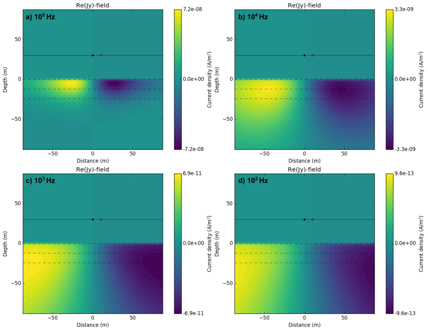 Fig. 101 Real part of \(E_y\) in \(x\text{-}z\) plane at 10 5 Hz a), 10 4 Hz a), 10 3 Hz a), and 10 2 Hz d).¶