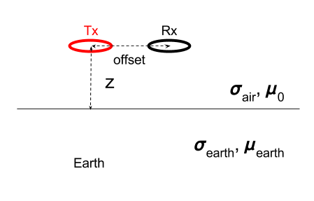 Fig. 96 A loop source in a half-space earth. \(\sigma_{air}\) and \(\sigma_{earth}\) conductivity of the air and earth, respectively. \(\mu_{0}\) and \(\mu_{earth}\) susceptibility of the air and earth, respectively. \(z\) and offset correspondingly indicate Tx height (m) and Tx-Rx offset (m).¶