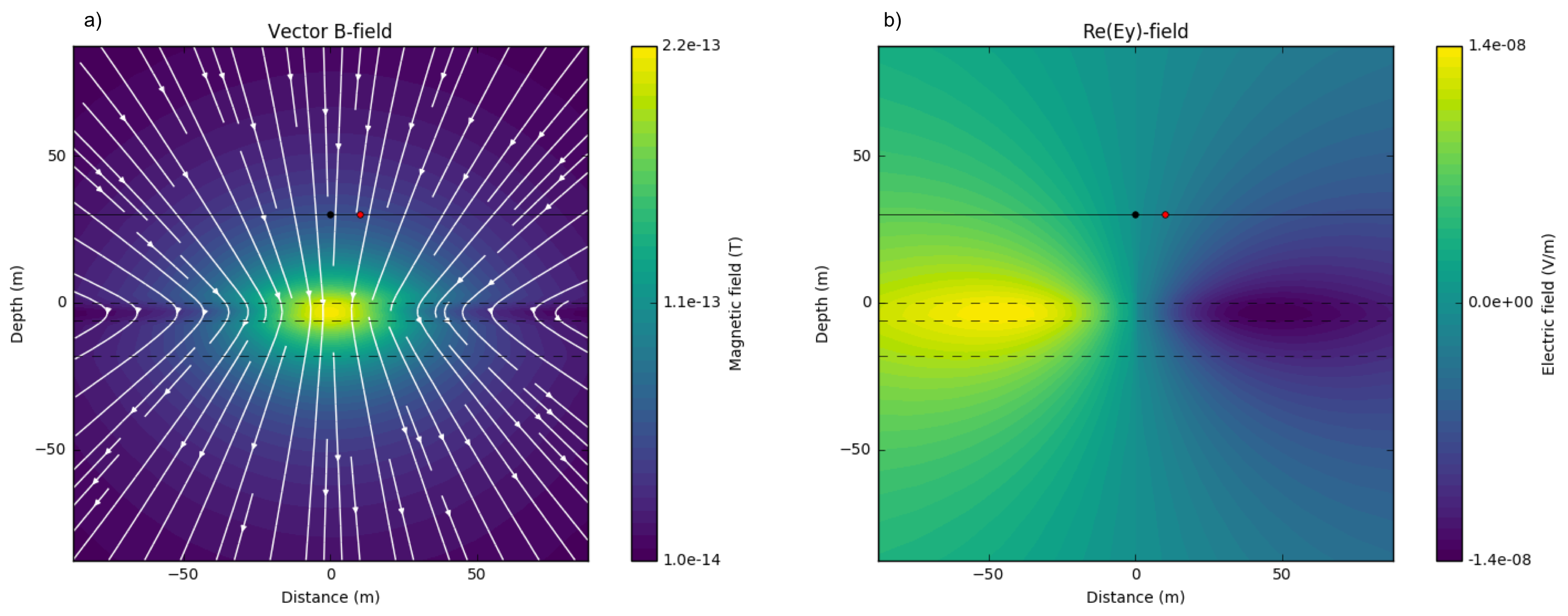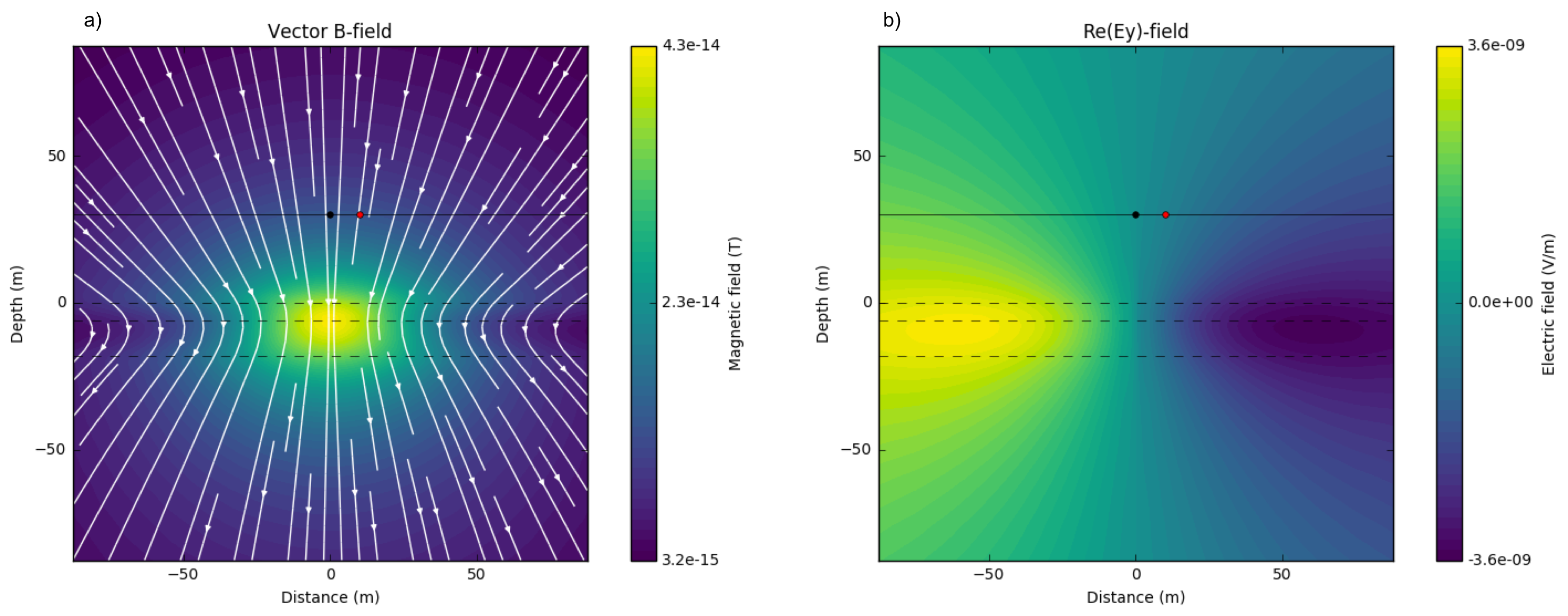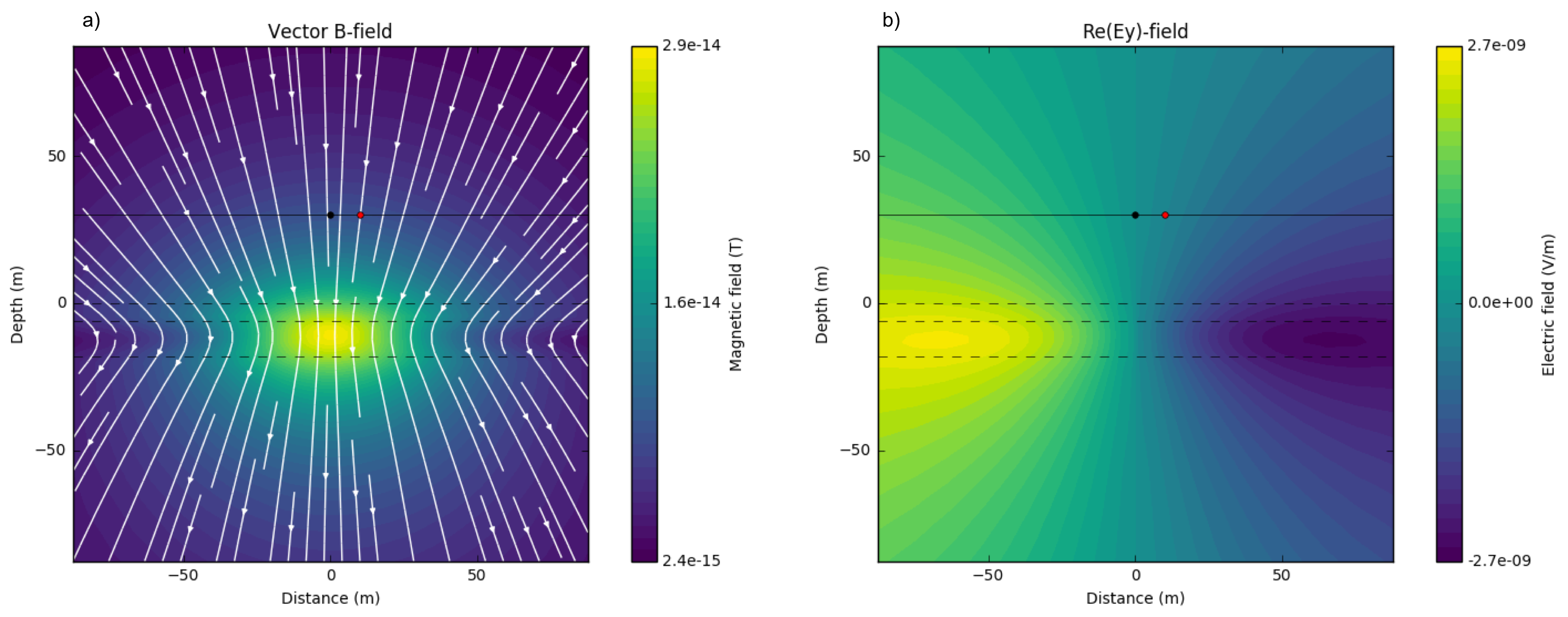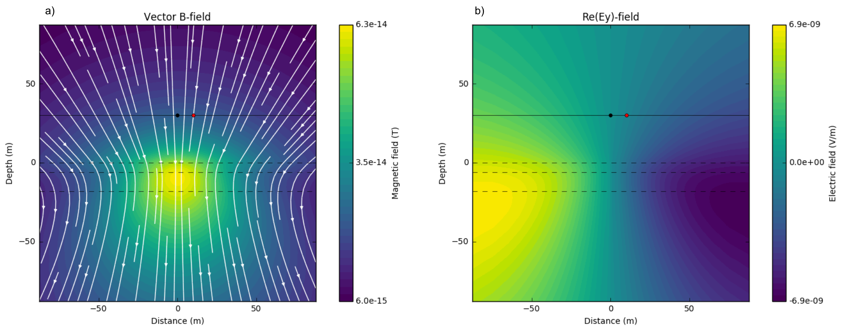 Fig. 109 Imaginary part of secondary magnetic flux a) and electric field in \(y\)-direction b). \(\sigma_1 = \sigma_2 = \sigma_3=\) 0.01 S/m; \(f\) = 1000 Hz.¶