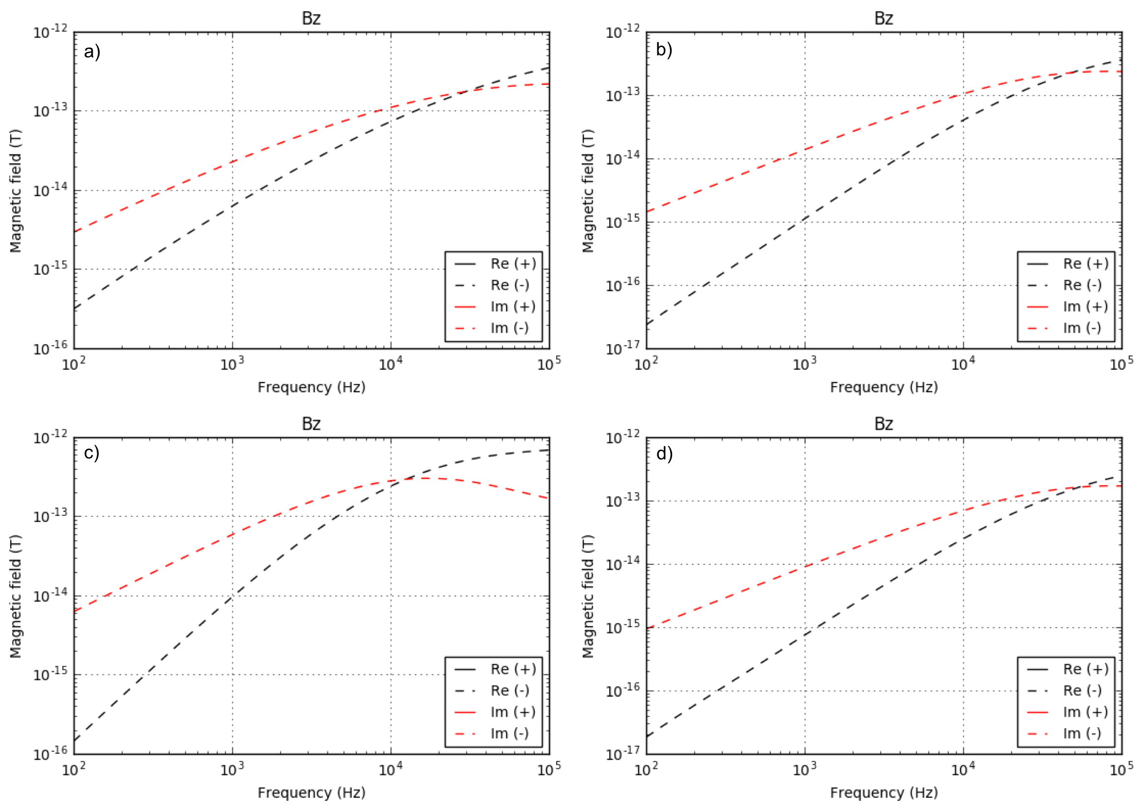 Fig. 113 Real and imaginary part of secondary \(B_z\) data at \(z\) = 10 m. a) Half-space model (\(\sigma_1=\sigma_2=\sigma_3\) = 0.01 S/m), b) basement model (\(\sigma_1=\sigma_2\) = 0.01 S/m and \(\sigma_3\) = 0.001 S/m), c) conductive cover model (\(\sigma_1\) = 0.1 S/m, \(\sigma_2\) = 0.01, and \(\sigma_3\) = 0.001 S/m), and d) resistive cover model (\(\sigma_1\) = 0.001 S/m, \(\sigma_2\) = 0.01, and \(\sigma_3\) = 0.001 S/m). Red and black lines distinguish real and imaginary part of the data, and solid and dashed line distigusih positive and negative values.¶