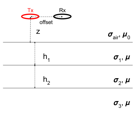 Fig. 108 A loop source in a layered-earth. \(\sigma_{air}\) is conductivity of the air layer, and suscript of conductivity stands for i-th layer. \(h_1\) and \(h_2\) correspondingly indicate thickness of 1st and 2nd layers. \(z\) and offset correspondingly indicate Tx height (m) and Tx-Rx offset (m).¶