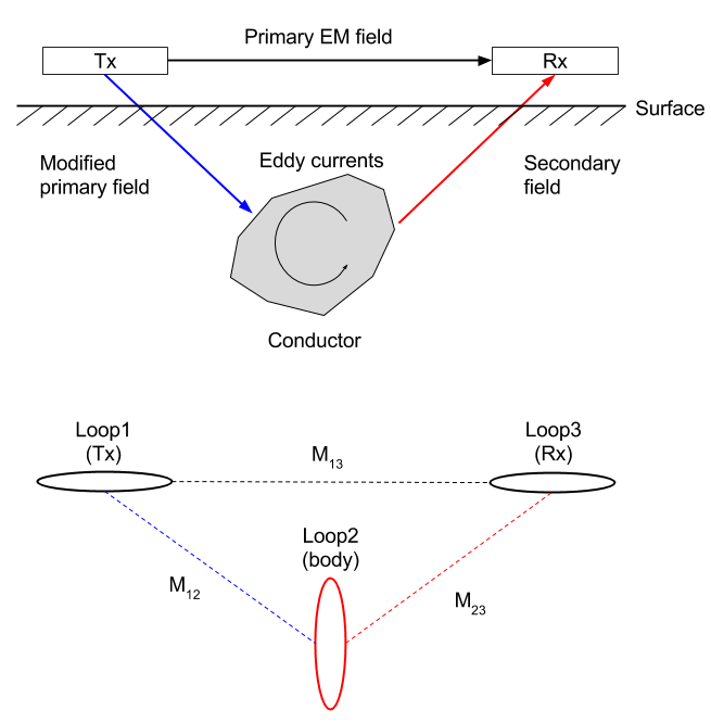 The basic EM survey is shown in Fig. 130. The time varying magnetic field (referred to as the primary field) in the Tx induces currents in the conductor. Those currents produce a secondary field that can be recorded at the receiver.