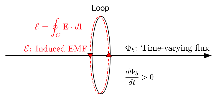 From Faraday’s Law, we establish the link between EMF (\(\mathcal{E}\), voltage), and time varying flux (\(\Phi_b\)). Below diagram illustrates how EMF could be generated from time-varying flux (\(\mathcal{E}= - \frac{d \Phi_b}{dt} = \imath \omega \Phi_b\)). The EMF (voltage) produces a current in the loop.