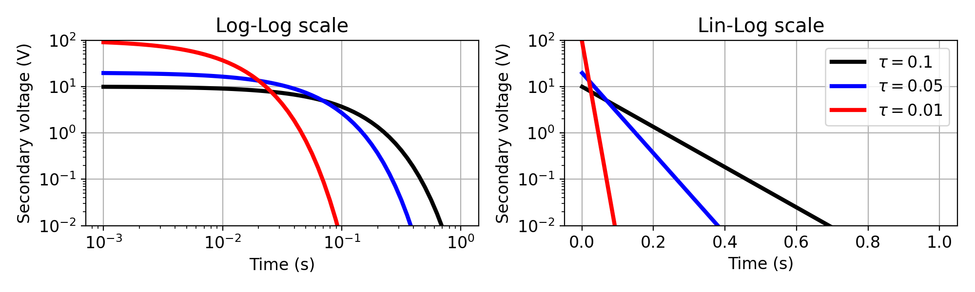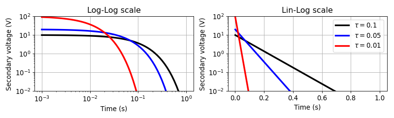 Below shows secondary voltage with variable \(\tau\) in Log-Log and Lin- Log plot. In the Lin-Log plot, exponential decay will be straight line.